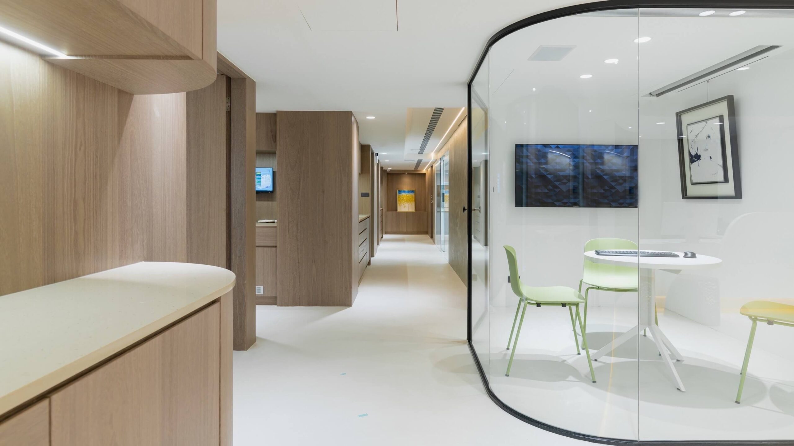 呈易美學牙醫的空間風格巧妙融合了現代簡約與日式侘寂的精髓,創造出一個既專業又溫馨的環境。 整體設計以白色與淺木色為主調,搭配流暢的弧形線條,讓空間擺脫傳統診所的冰冷感,顯得格外柔和舒適。大理石與木質等天然材質的運用,不僅提升了空間的質感,也呼應了日式侘寂美學中追求的自然與質樸。 透過極簡的設計、暖黃的燈光,以及富有設計感的家具,這裡不僅是看診的地方,更像是一個能讓人放鬆身心的療癒空間。這種獨特的風格,成功傳達了品牌對於美學與舒適的重視,讓病患從踏入診所的那一刻起,就能感受到專業且人性化的服務。